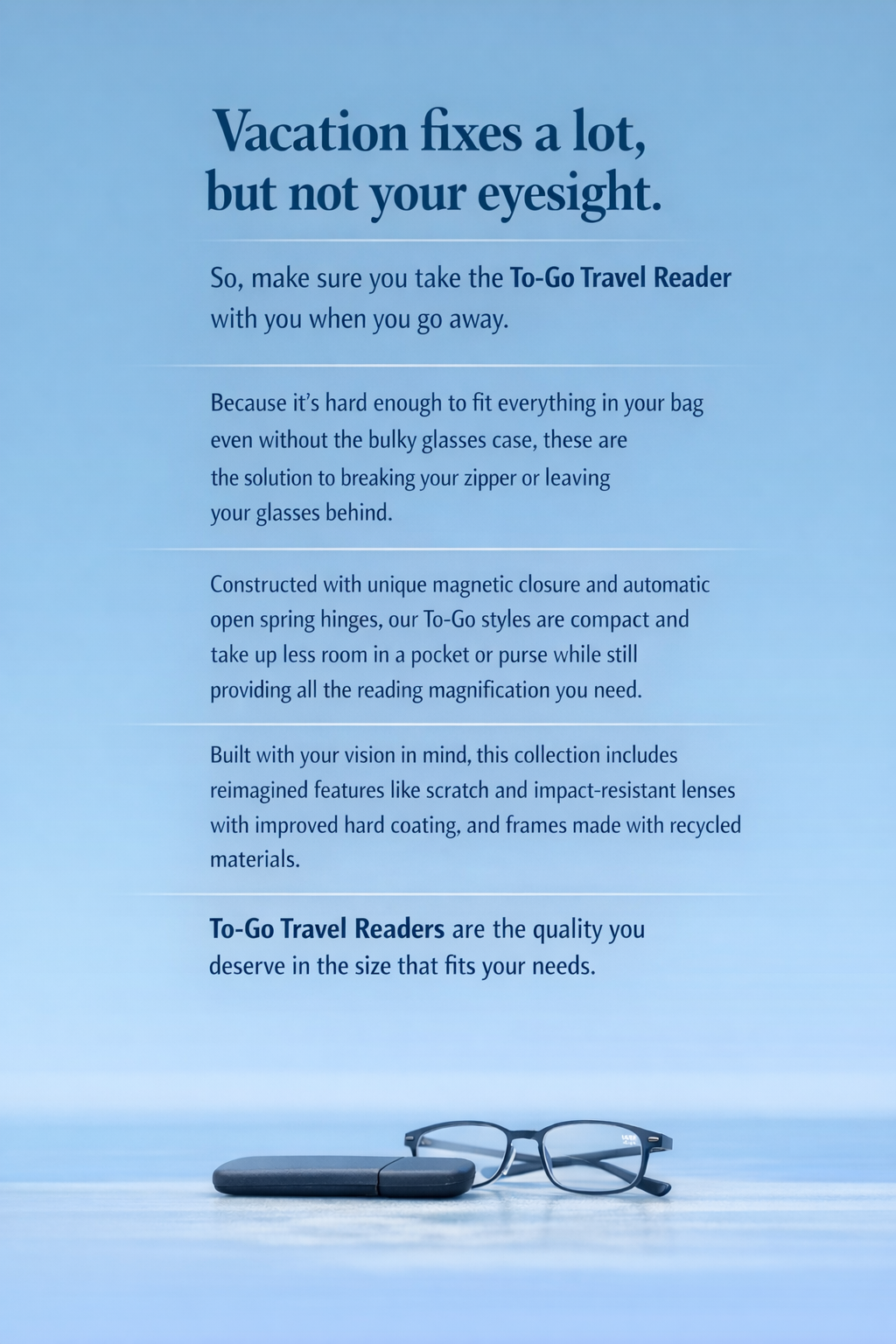 I positioned this collection in a way that reframes reading glasses as a convenient travel essential, using a light, easygoing tone to remove the stigma and make the product feel more like a natural part of the trip.