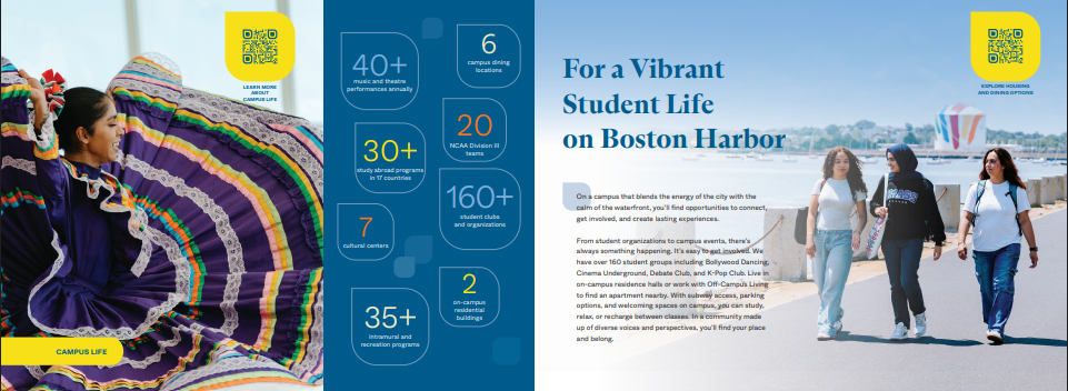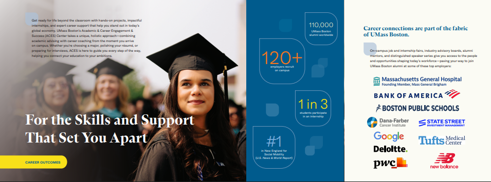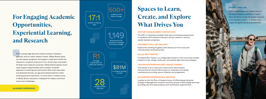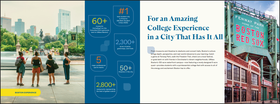 This piece reaches prospective students and their families nationwide and internationally. It’s designed to highlight what students gain from UMass Boston and positions the university as a place where they can visualize their future and opportunities.